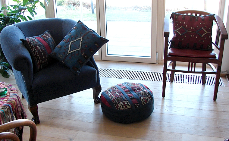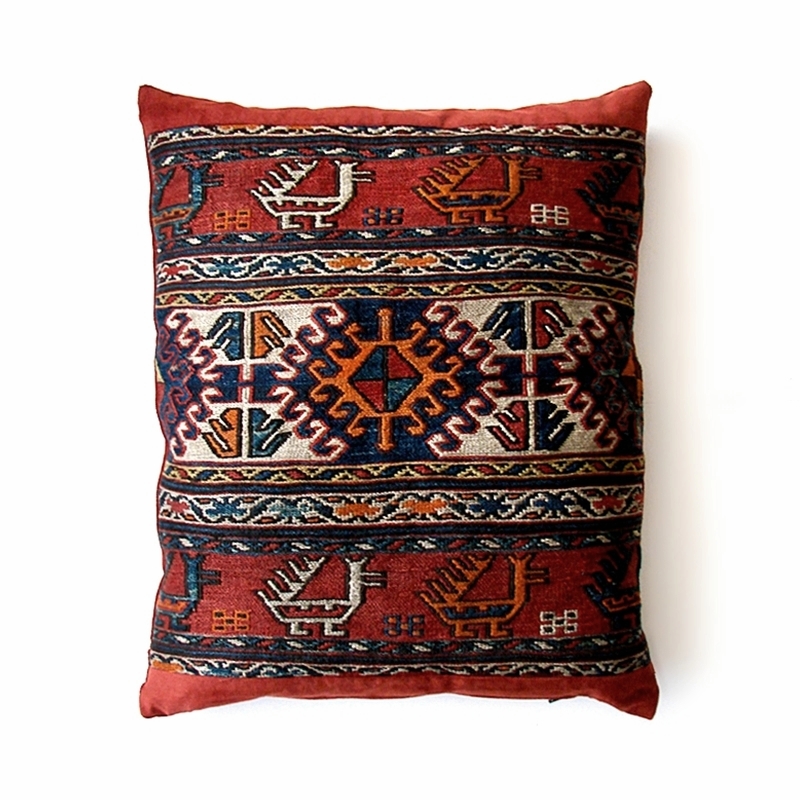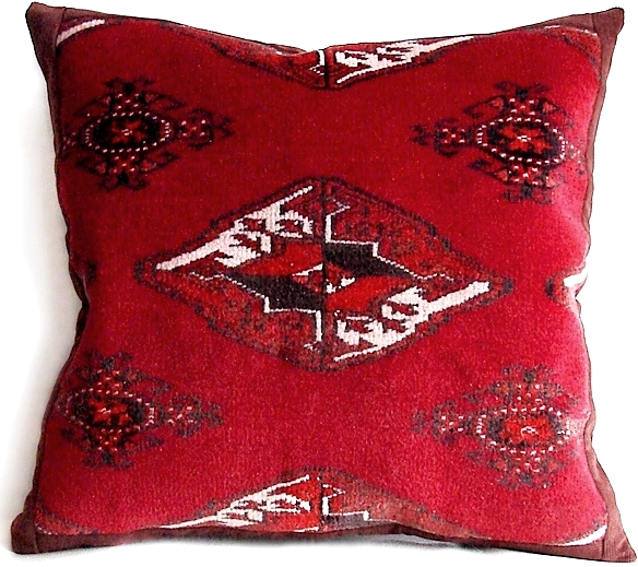 Nomád csomózott szőnyegekből készült párnák. Az eredeti szőnyegek türkmen Buchara és iszfaháni Yallameh típusúak voltak.